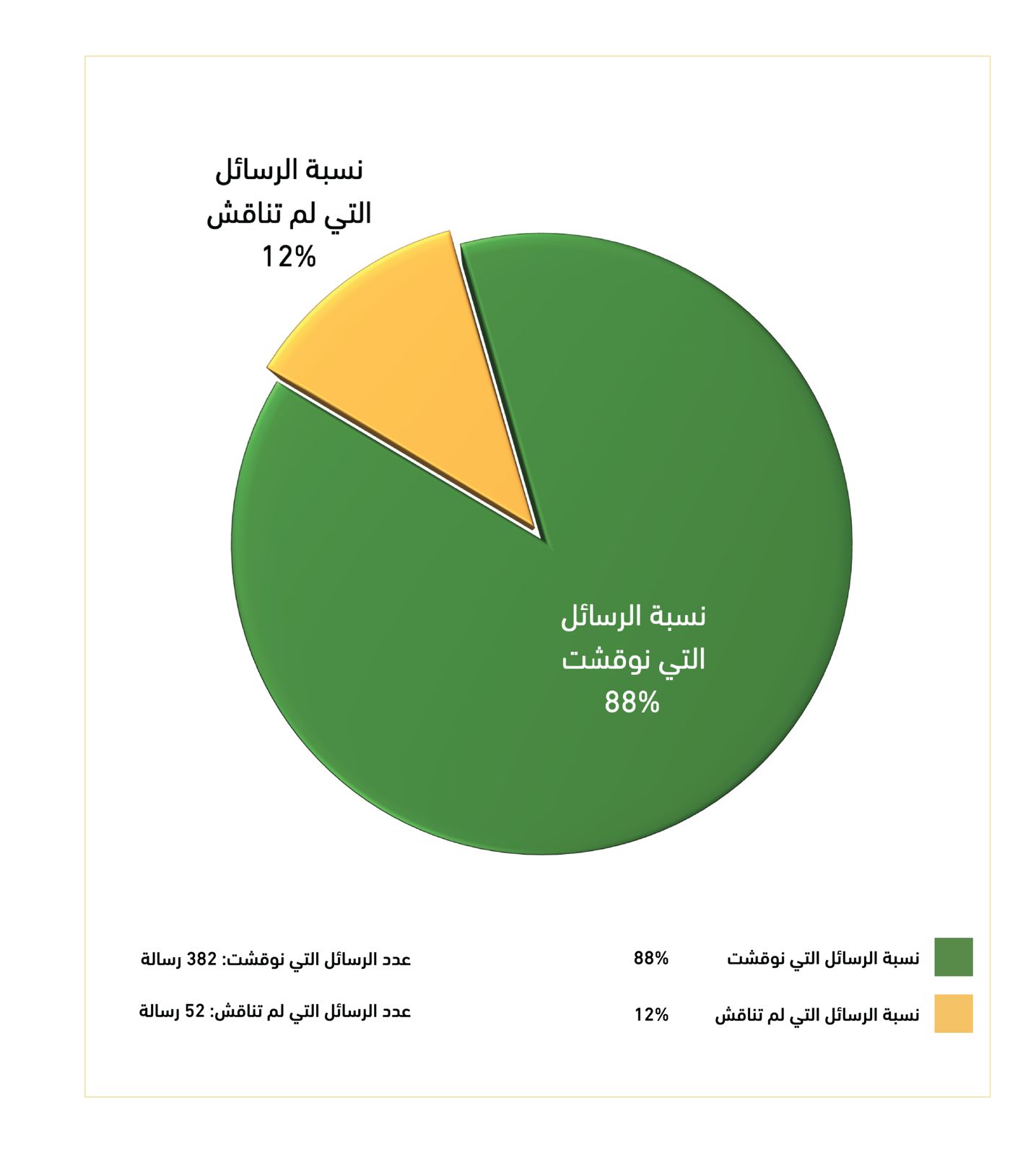 رسم بياني يوضح عدد الرسائل العلمية التي نوقشت في قسم القراءات ونسبتها مقارنة إلى غيرها من باقي الرسائل التي لم تناقش