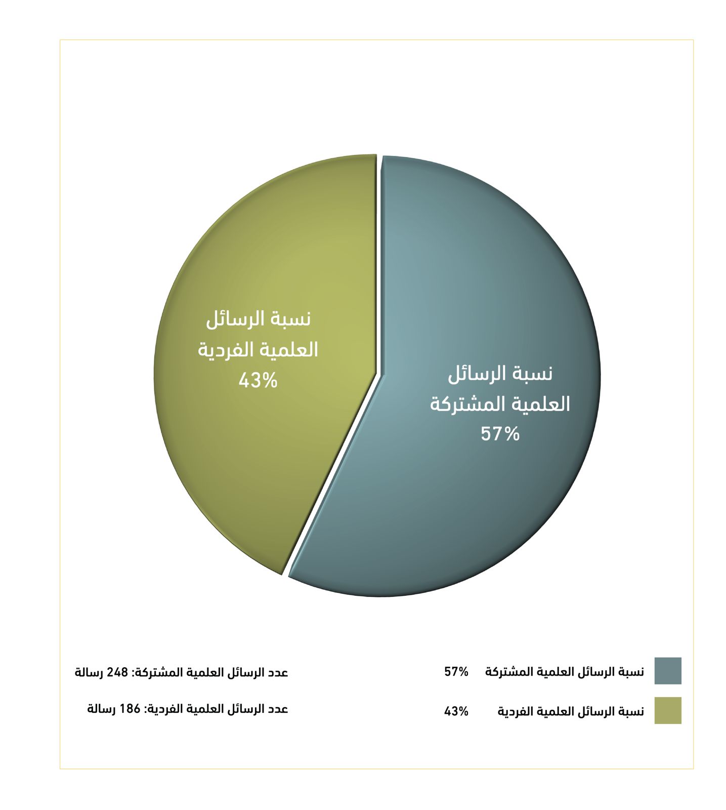 رسم بياني يبين عدد الرسائل العلمية في المشاريع المشتركة وهي الرسائل التي شارك في إعدادها مجموعة من الباحثن، وعدد الرسائل العلمية الفردية وهي التي درسها باحث واحد ونسبة كل منهما