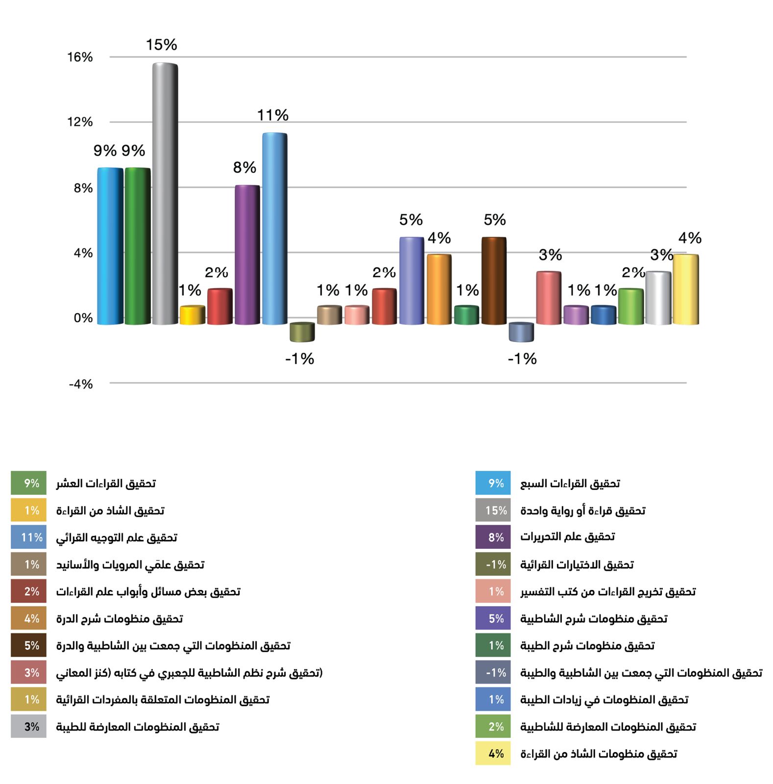 يوضح هذا الرسم البياني نسبــةُ الرسائل العلميــة في قسم الدراسة والتحقيق إلى إجمالي الرسائل العلمية في علم القراءات.
