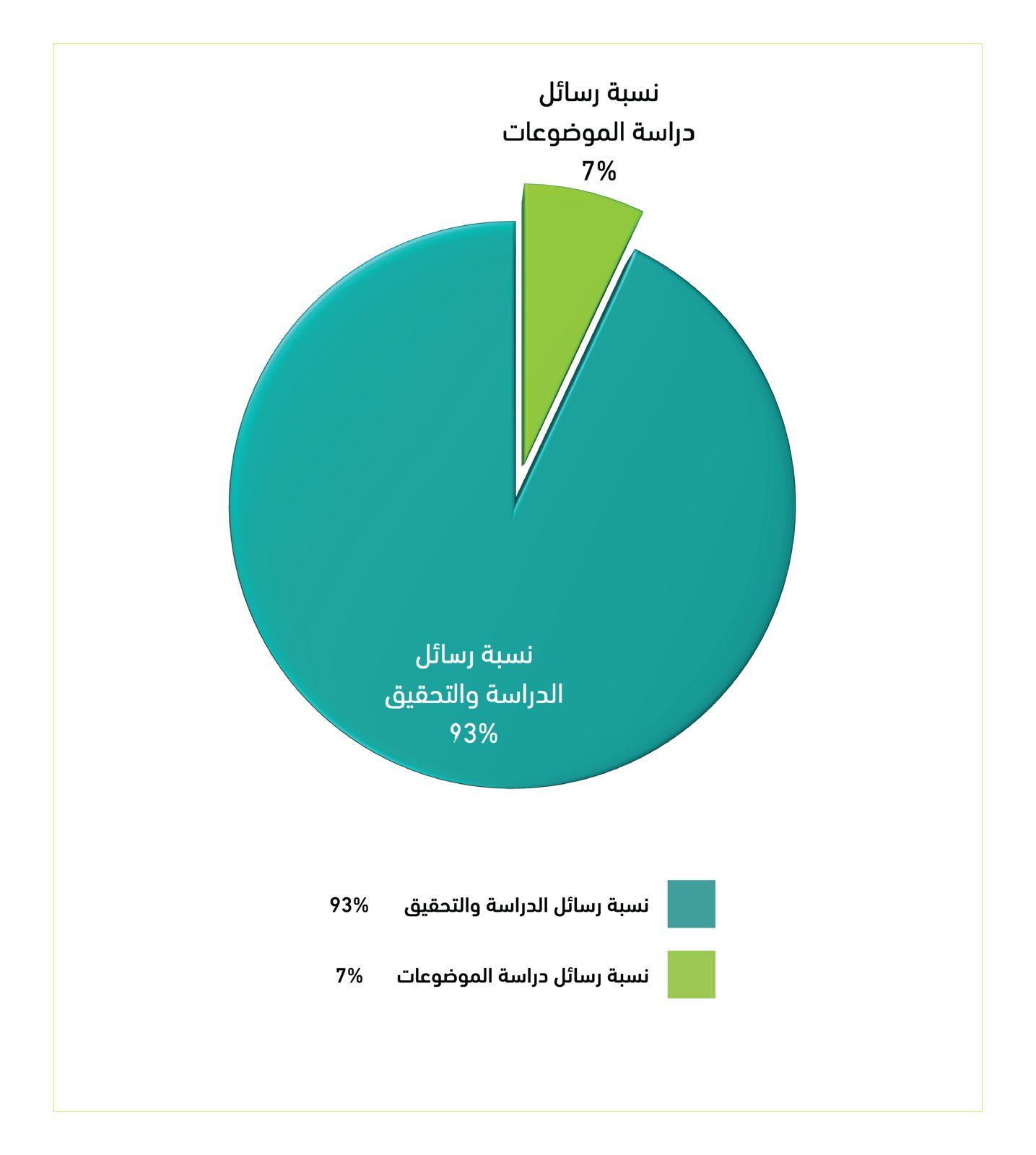 تبين هذه الصورة نسبة الرسائل العلمية في علم التجويــد في مجال دراسة الموضوعات إلى إجمالي رسائل الدراسة والتحقيق.